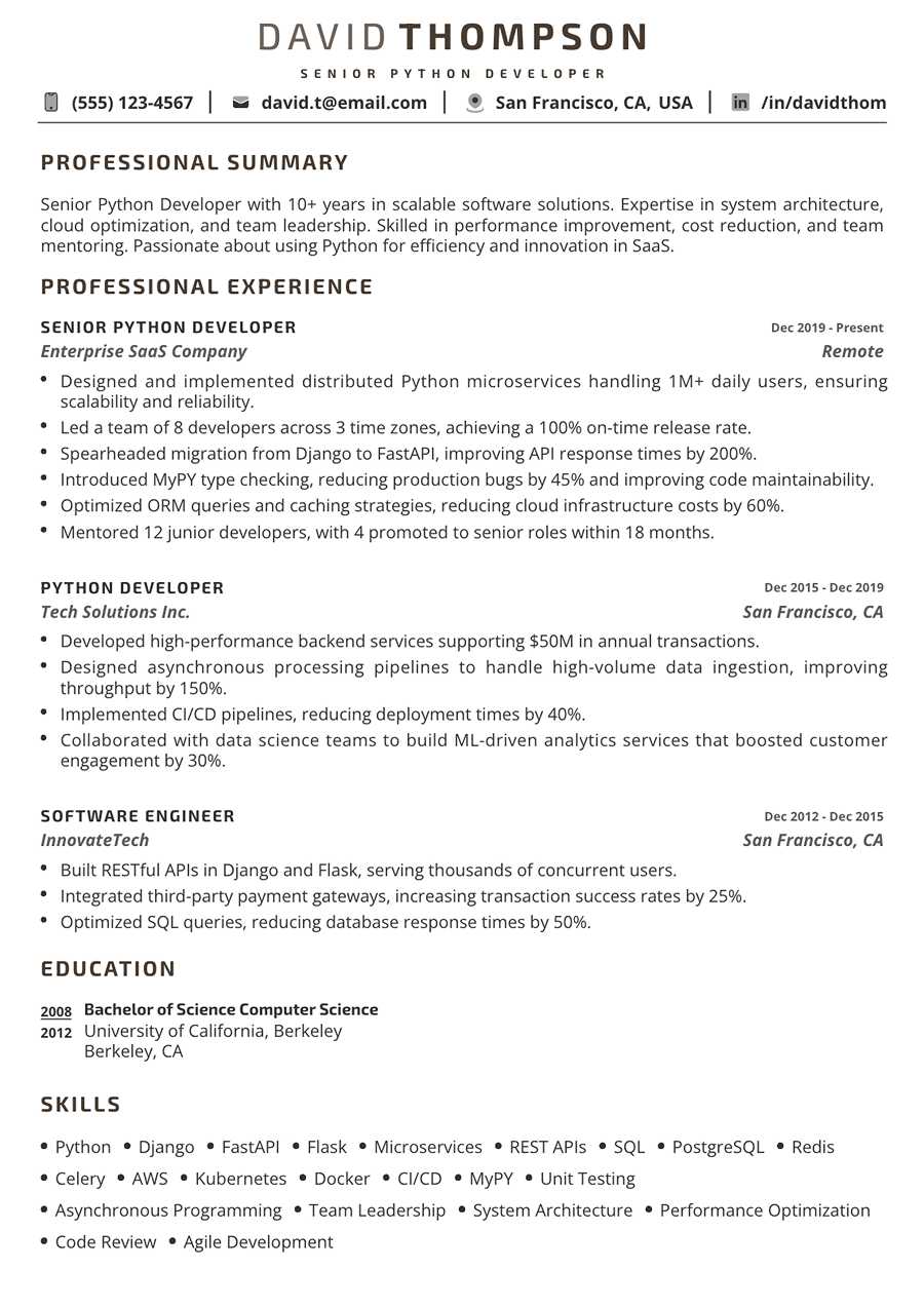 Employment History SENIOR PYTHON DEVELOPER at Enterprise SaaS Company From 2020-01-01 to Present Designed and implemented distributed Python microservices handling 1M+ daily users, ensuring scalability and reliability.Led a team of 8 developers across 3 time zones, achieving a 100% on-time release rate.Spearheaded migration from Django to FastAPI, improving API response times by 200%.Introduced MyPY type checking, reducing production bugs by 45% and improving code maintainability.Optimized ORM queries and caching strategies, reducing cloud infrastructure costs by 60%.Mentored 12 junior developers, with 4 promoted to senior roles within 18 months.