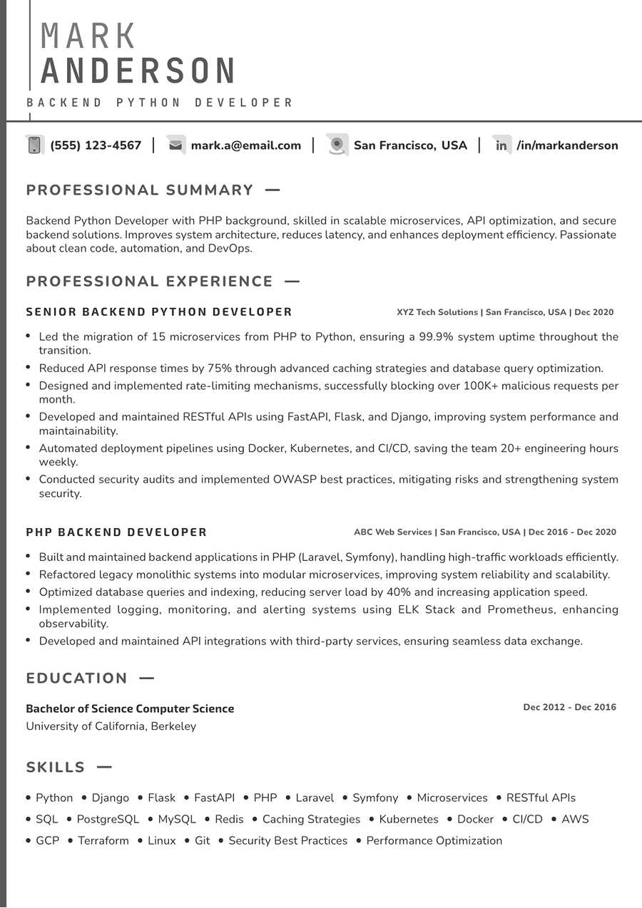 Employment History SENIOR BACKEND PYTHON DEVELOPER at XYZ Tech Solutions From 2021-01 to Led the migration of 15 microservices from PHP to Python, ensuring a 99.9% system uptime throughout the transition.Reduced API response times by 75% through advanced caching strategies and database query optimization.Designed and implemented rate-limiting mechanisms, successfully blocking over 100K+ malicious requests per month.Developed and maintained RESTful APIs using FastAPI, Flask, and Django, improving system performance and maintainability.Automated deployment pipelines using Docker, Kubernetes, and CI/CD, saving the team 20+ engineering hours weekly.Conducted security audits and implemented OWASP best practices, mitigating risks and strengthening system security.