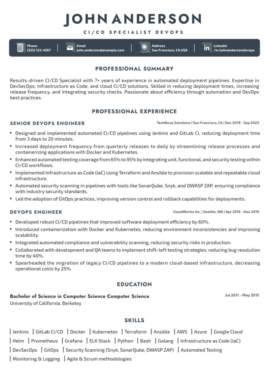 Professional Summary Results-driven CI/CD Specialist with 7+ years of experience in automated deployment pipelines. Expertise in DevSecOps, Infrastructure as Code, and cloud CI/CD solutions. Skilled in reducing deployment times, increasing release frequency, and integrating security checks. Passionate about efficiency through automation and DevOps best practices.