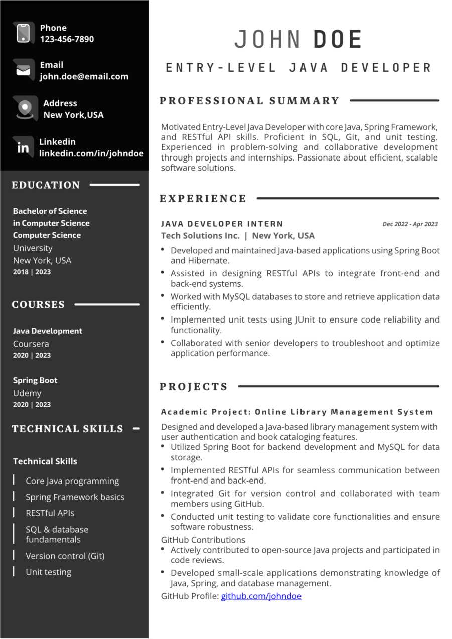 Employment History JAVA DEVELOPER INTERN at Tech Solutions Inc. From 2023-01-01 to 2023-05-01 Developed and maintained Java-based applications using Spring Boot and Hibernate.Assisted in designing RESTful APIs to integrate front-end and back-end systems.Worked with MySQL databases to store and retrieve application data efficiently.Implemented unit tests using JUnit to ensure code reliability and functionality.Collaborated with senior developers to troubleshoot and optimize application performance.