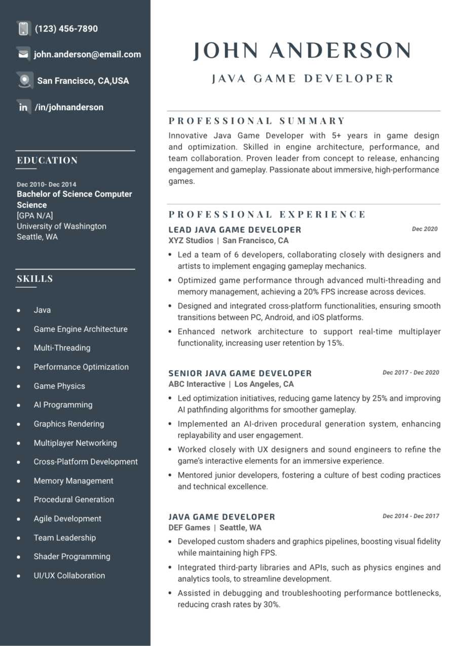Employment History LEAD JAVA GAME DEVELOPER at XYZ Studios From 2021-01-01 to Led a team of 6 developers, collaborating closely with designers and artists to implement engaging gameplay mechanics.Optimized game performance through advanced multi-threading and memory management, achieving a 20% FPS increase across devices.Designed and integrated cross-platform functionalities, ensuring smooth transitions between PC, Android, and iOS platforms.Enhanced network architecture to support real-time multiplayer functionality, increasing user retention by 15%.