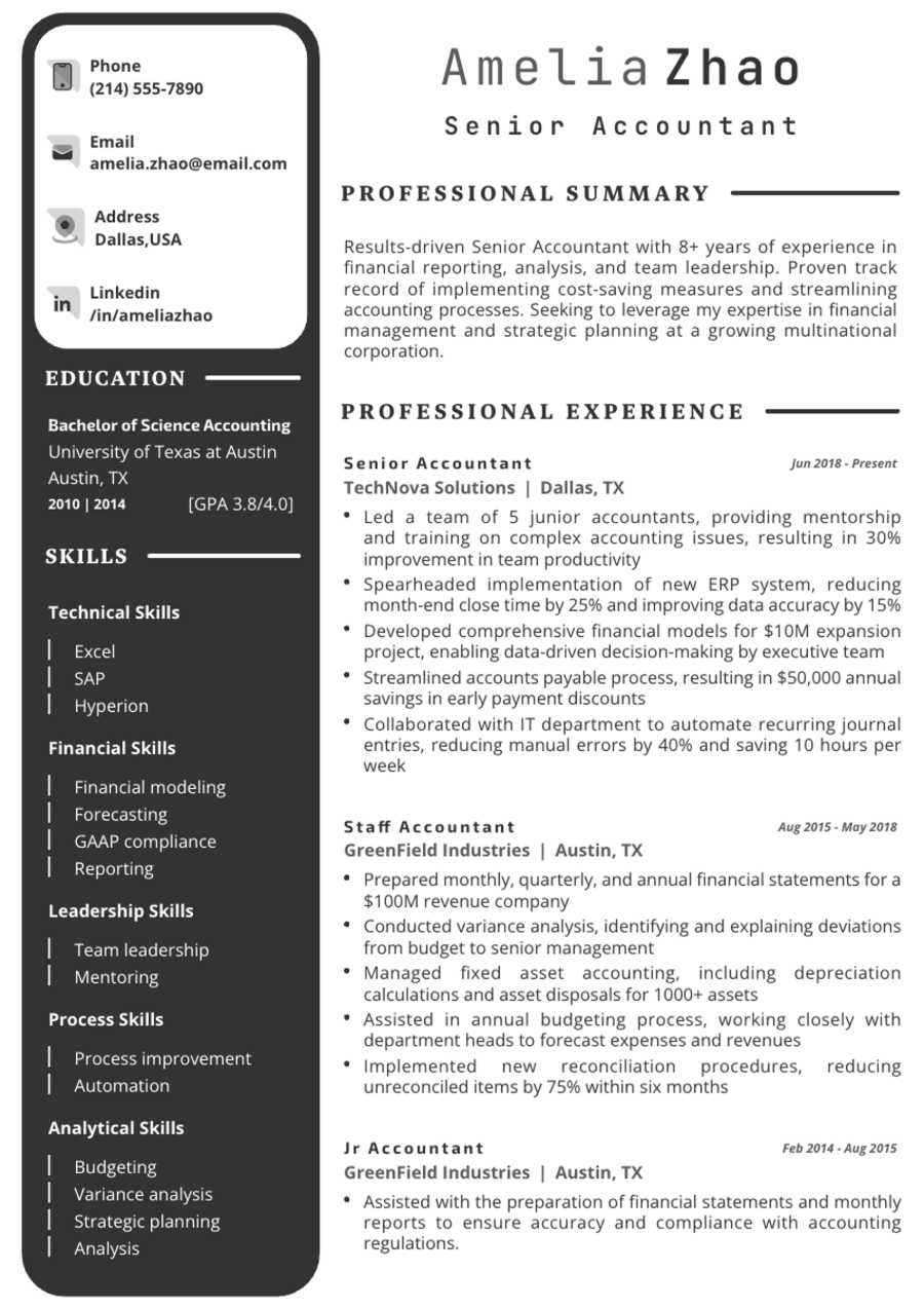 Highlight your leadership skills and strategic contributions. Employers at this stage will want to see how you've shaped or improved broader financial processes.