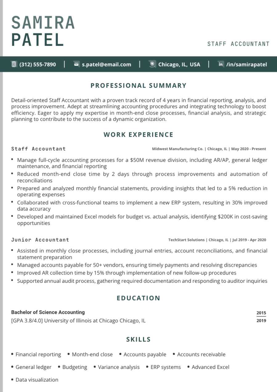 Use Industry-Specific Keywords: Include keywords like “GAAP,” “financial statement preparation,” and “risk assessment” to pass Applicant Tracking Systems (ATS).
