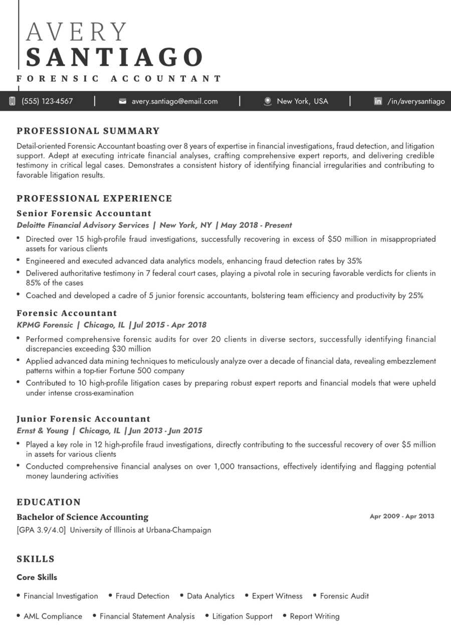 Stress your attention to detail and ability to dig deep into financials to uncover fraud or errors. Employers will want to see results, so don’t shy away from metrics.
