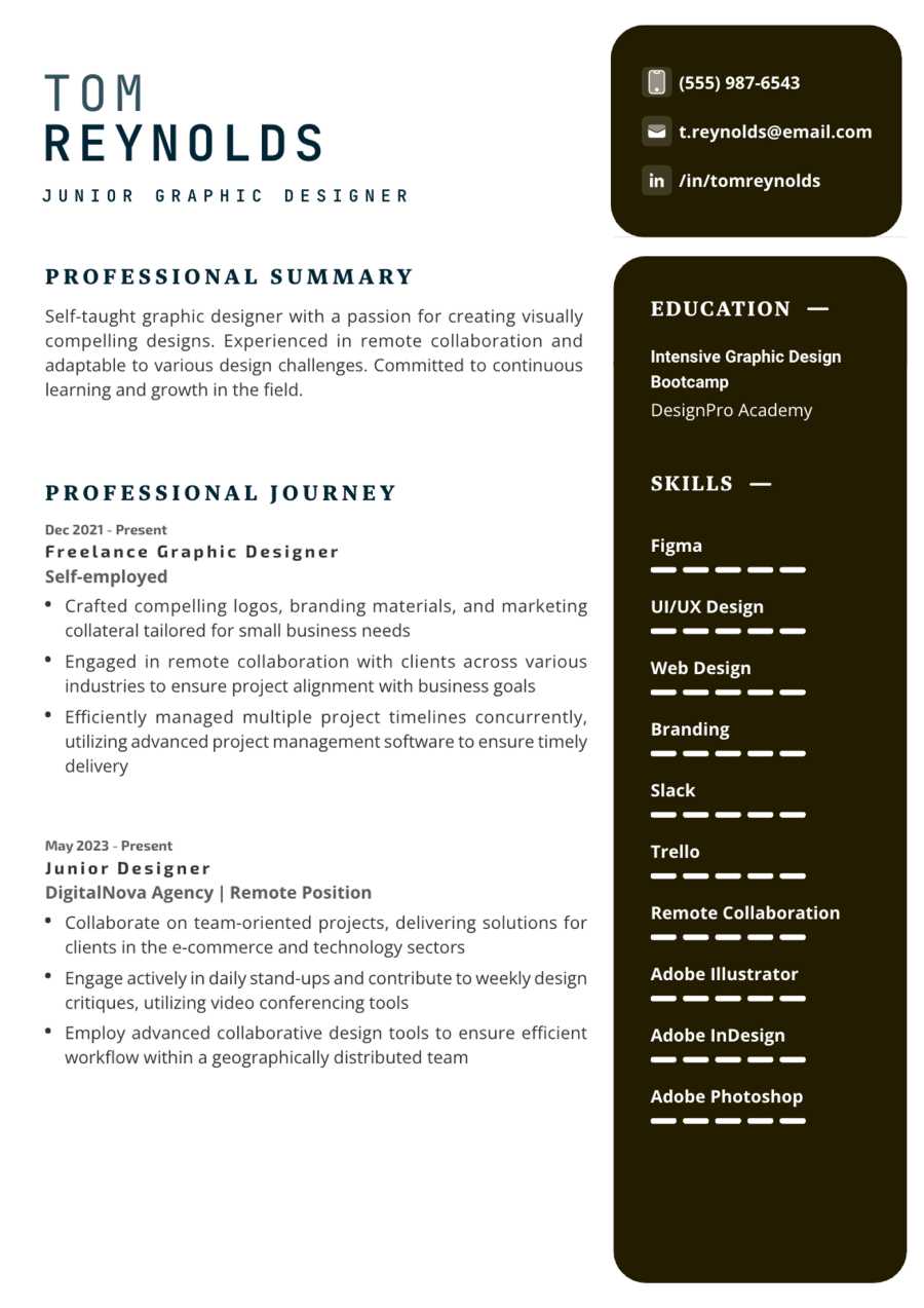 Example: Tom, a self-taught designer, showcases his growth from freelance work to team-based projects. His resume includes a timeline of his self-guided learning, proficiency in collaborative tools (Slack, Trello, Figma), and examples of remote projects, emphasizing his adaptability to hybrid and remote work environments.