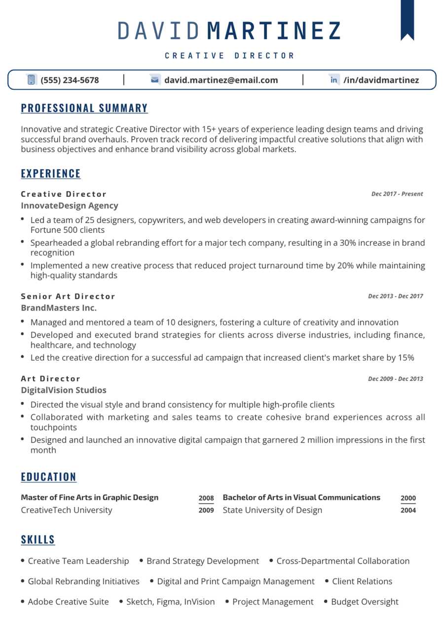 Example: David, applying for a creative director role, uses a sleek, organized resume with a focus on leadership and strategic initiatives. His resume highlights his experience leading design teams, working across departments, and delivering successful brand overhauls. He includes key accomplishments, such as leading a global rebranding effort or launching a successful ad campaign.