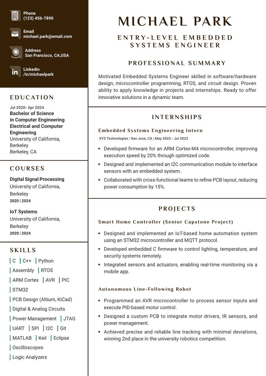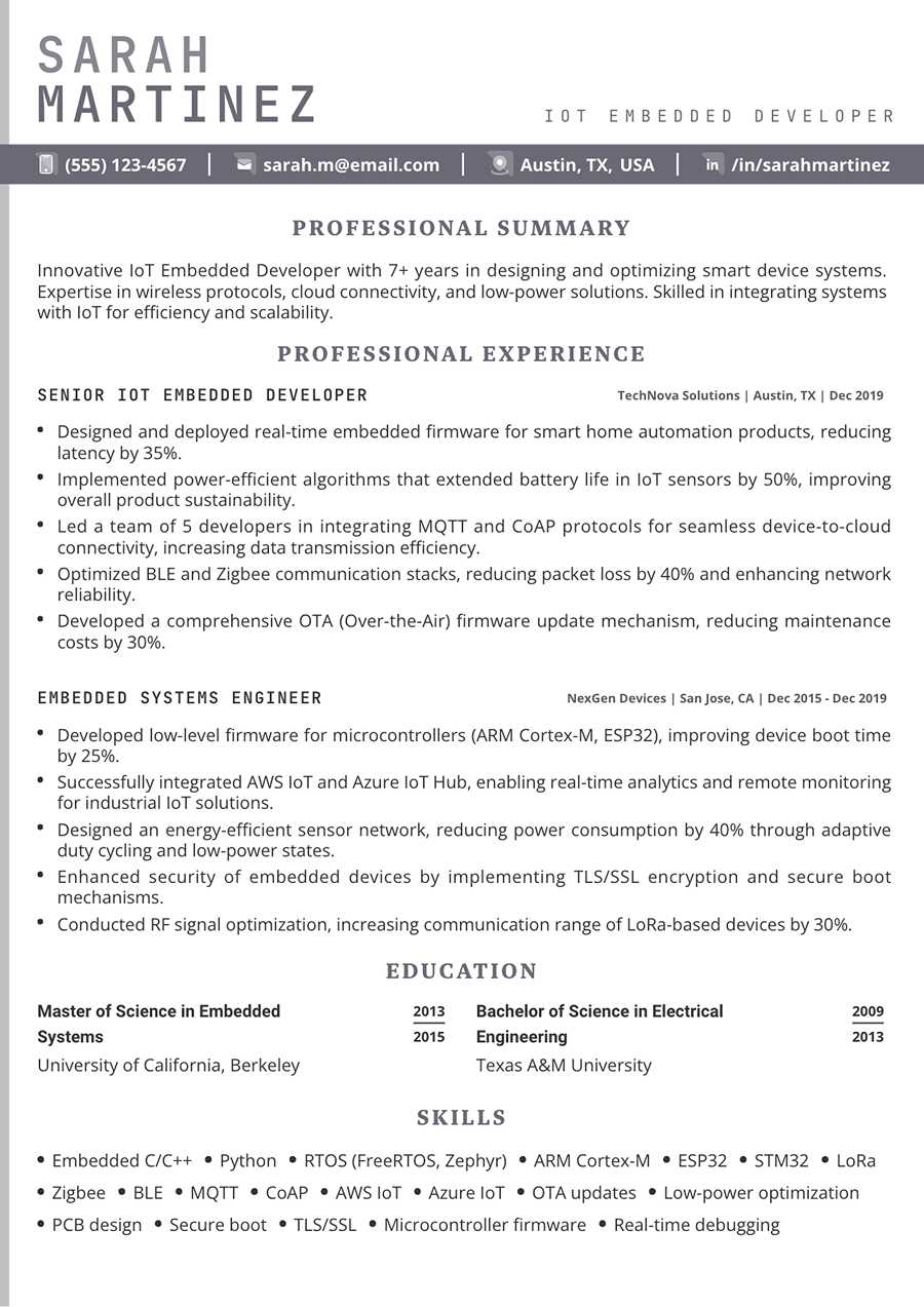 Remember: The best embedded systems resumes don’t just list skills – they demonstrate how you’ve used those skills to solve real-world problems. Now get out there and show employers what you can bring to their embedded systems team!