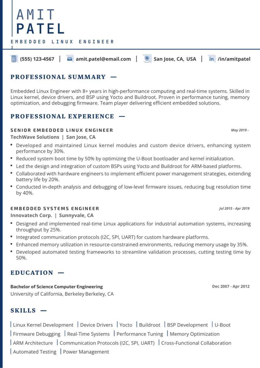 Amit showcases his depth in Linux-based embedded development, providing quantified results like "Reduced system boot time by 50% by optimizing the U-Boot bootloader and kernel initialization." His resume also highlights cross-functional collaboration with hardware and cloud engineers.