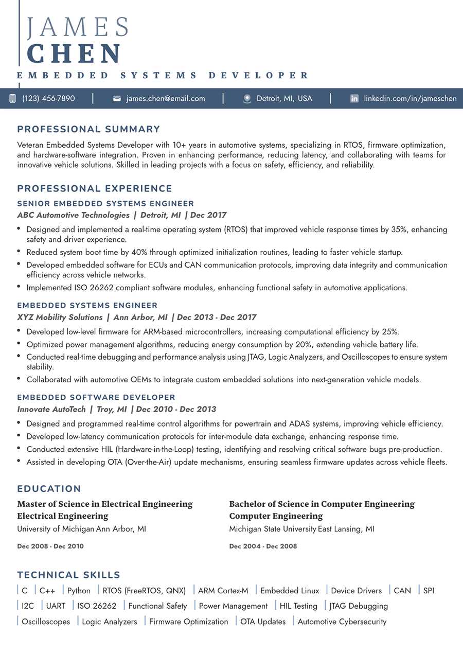 Meet James Chen, a veteran embedded systems developer with over 10 years in automotive systems. His resume immediately catches attention with its clear organization and impressive achievements.